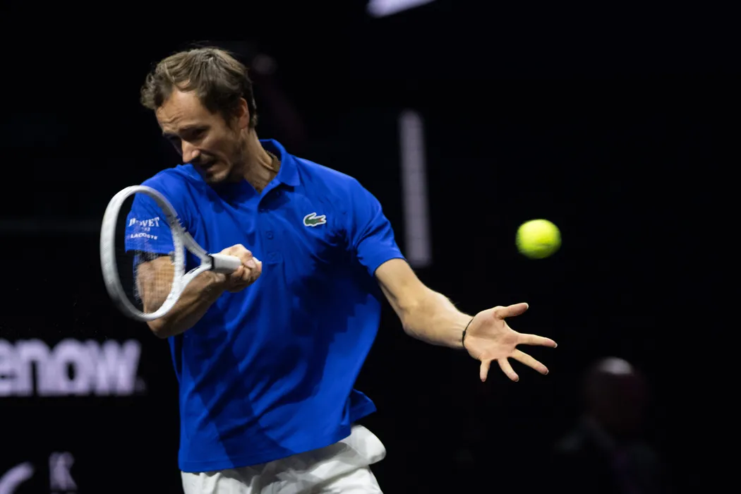 22 September 2024, Berlin: Russia's Daniil Medvedev in action against USA's Ben Shelton during their men's singles tennis match at the Laver Cup at Uber Arena. Photo: Christophe Gateau/dpa