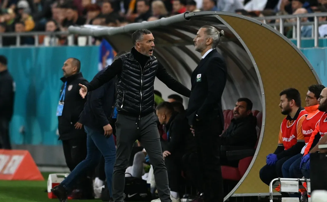 Mihai Stoica reactioneaza alaturi de Eduard Alexandru in meciul de fotbal dintre FCSB si CFR Cluj, contand pentru Play-off-ul Superligii Superbet, desfasurat pe Arena Nationala din Bucuresti, duminica 14 mai 2023.,Image: 775861451, License: Rights-managed, Restrictions: , Model Release: no