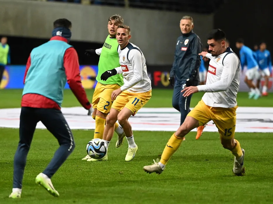 Fotbalistii romani Andrei Ratiu,Nicușor Bancu si Andrei Burca la incalzire in meciul de fotbal dintre Israel si Romania, din cadrul preliminariilor Campionatului European 2024, desfasurat pe Puskás Akadémia Pancho Aréna din Felcsut, sambata 18 noiembrie 2023. © FOTO:Razvan Pasarica/SPORT PICTURES