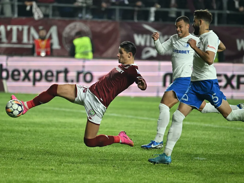 Mihai Alexandru Dobre marchează un nou gol de lângă Gustavo Henrique Marins Silva si Bogdan Ionut Tiru in meciul de fotbal dintre Rapid Bucuresti si Farul Constanta, din cadrul Superligii Superbet, desfasurat pe Superbet Arena-Giulesti din Bucuresti, luni 21 octombrie 2024. © FOTO:Razvan Pasarica/SPORT PICTURES