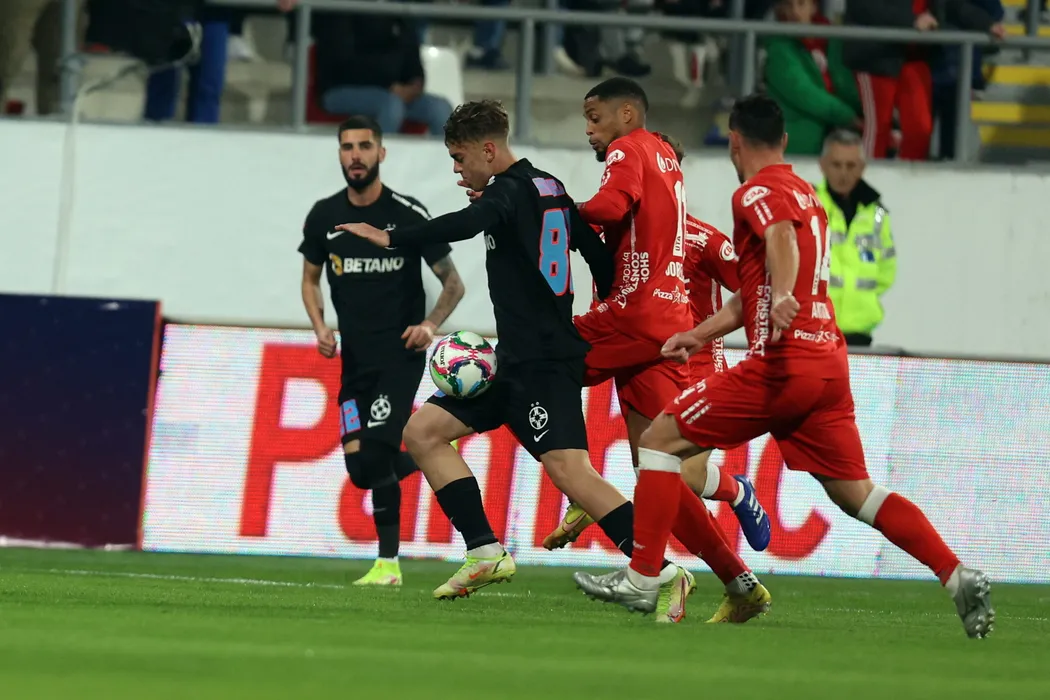Eduard Radaslavescu (S), de la FCSB, suteaza in timpul meciului de fotbal contra echipei UTA Arad din prima etapa a grupei B a Cupei Romaniei, disputat pe stadionul Francisc Neuman, miercuri, 19 octombrie 2022. CIPRIAN PETCUT/ MEDIAFAX FOTO