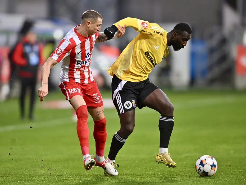 Issouf Macalou si Andrea Padula in meciul de fotbal dintre UTA Arad si FC Universitatea Cluj, contand pentru Superliga Superbet, desfasurat pe Arena Francisc Neuman din Arad, sambata 22 noiembrie 2025. © FOTO:Leczki Jozsi/SPORT PICTURES