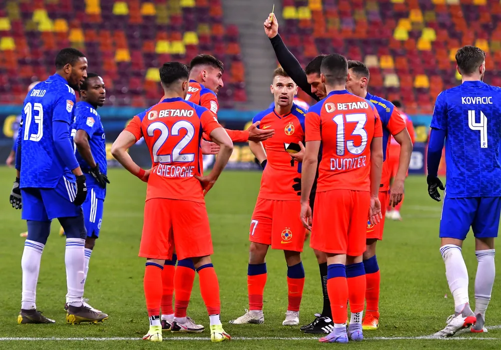 Arbitrul central Istvan Kovacs acorda un cartonas rosu lui Iulian Lucian Cristea sub privirea lui Darius Dumitru Olaru si Bradley Diallo in meciul de fotbal dintre FCSB si FC U Craiova, contand pentru Liga 1 Casa Pariurilor, desfasurat pe Arena Nationala din Bucuresti, duminica 6 februarie 2022. © FOTO:Razvan Pasarica/SPORT PICTURES