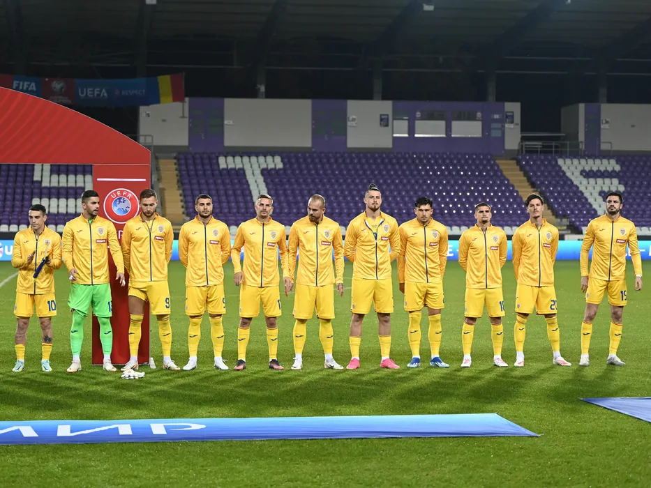Fotbalistii romani la startul meciului de fotbal dintre Belarus si Romania, din cadrul preliminariilor Campionatului European 2024, desfasurat pe Stadionul Szusza Ferenc din Budapesta, joi 12 octombrie 2023. © FOTO:Razvan Pasarica/SPORT PICTURES