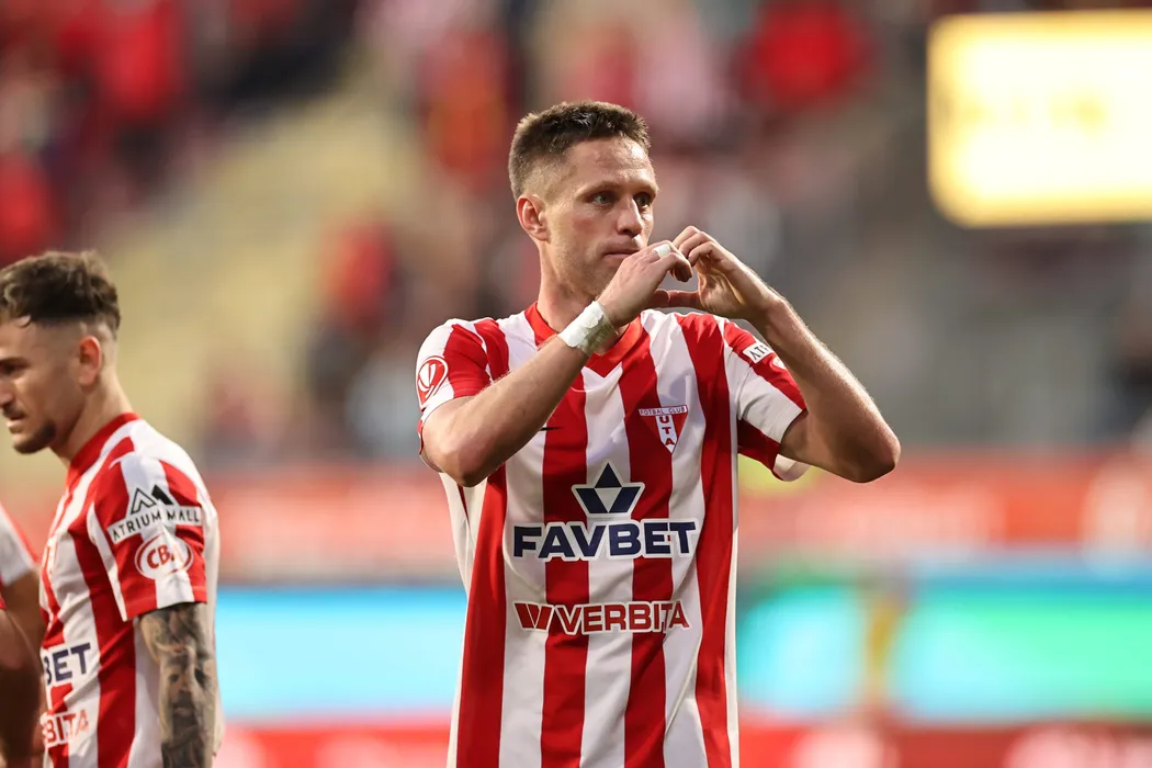 Dmytro Pospielov cu o dedicatie dupa un gol marcat in meciul de fotbal dintre UTA Arad si FC Metaloglobus Bucuresti contand pentru Superliga Superbet, desfasurat pe Arena Francisc Neuman din Arad, duminica 2 noiembrie 2025. © FOTO:Sebastian Tataru/SPORT PICTURES