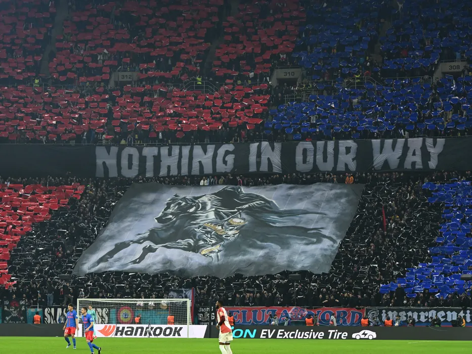 „Cei patru călăreți ai Apocalipsei” au urcat în tribunele peluzei roș-albastre în FCSB – Lyon. Imagini cu scenografia memorabilă, inspirată din Noul Testament