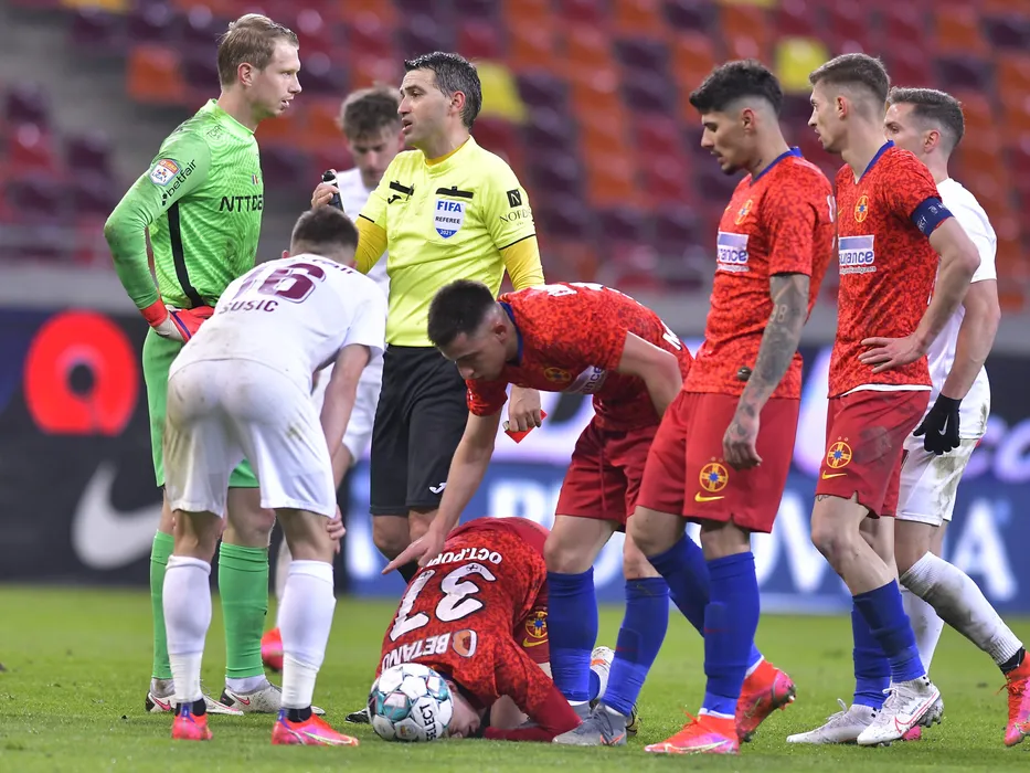 Arbitrul central Ovidiu Hategan, Giedrius Arlauskis , Olimpiu Vasile MorutanFlorin Lucian Tanase, Florinel Teodor Coman si Octavian George Popescu la pamant in meciul de fotbal dintre FCSB si CFR Cluj, contand pentru Liga 1 Casa Pariurilor, desfasurat fara spectatori pe Arena Nationala din Bucuresti, vineri 19 martie 2021. © FOTO:Razvan Pasarica/SPORT PICTURES