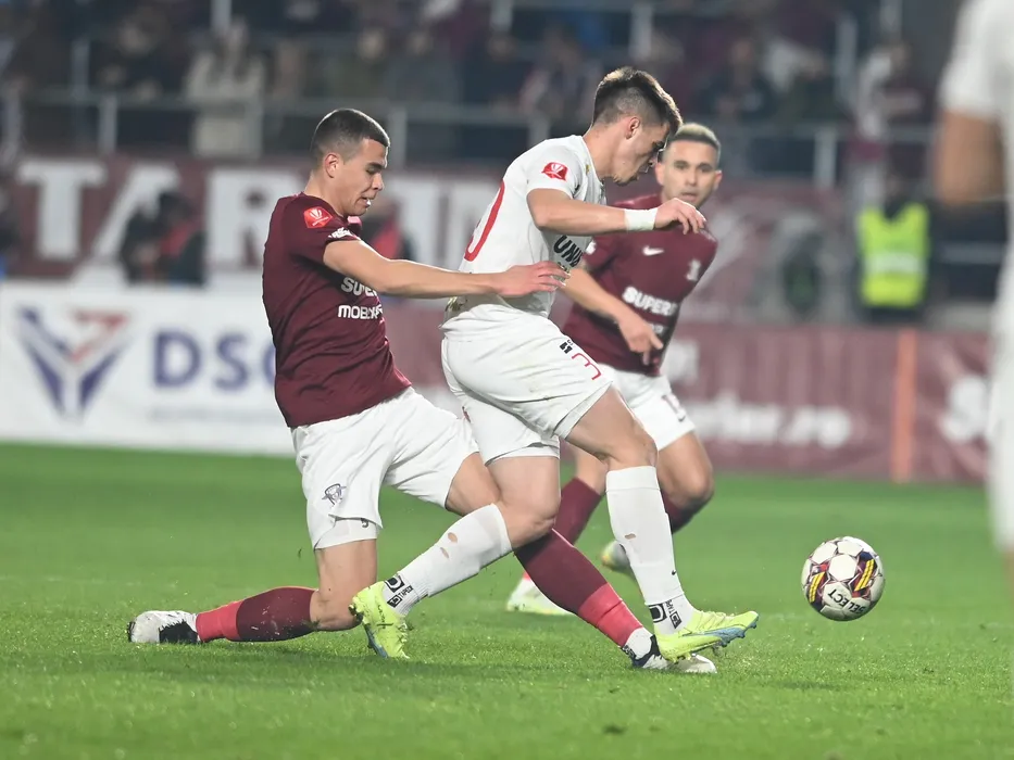 Cristian Ignat si George Daniel Paraschiv in meciul de fotbal dintre Rapid Bucuresti si FC Hermannstadt, contand pentru Superliga Superbet, desfasurat pe Stadionul Rapid Giulesti din Bucuresti, sambata 4 martie 2023.,Image: 760353780, License: Rights-managed, Restrictions: , Model Release: no