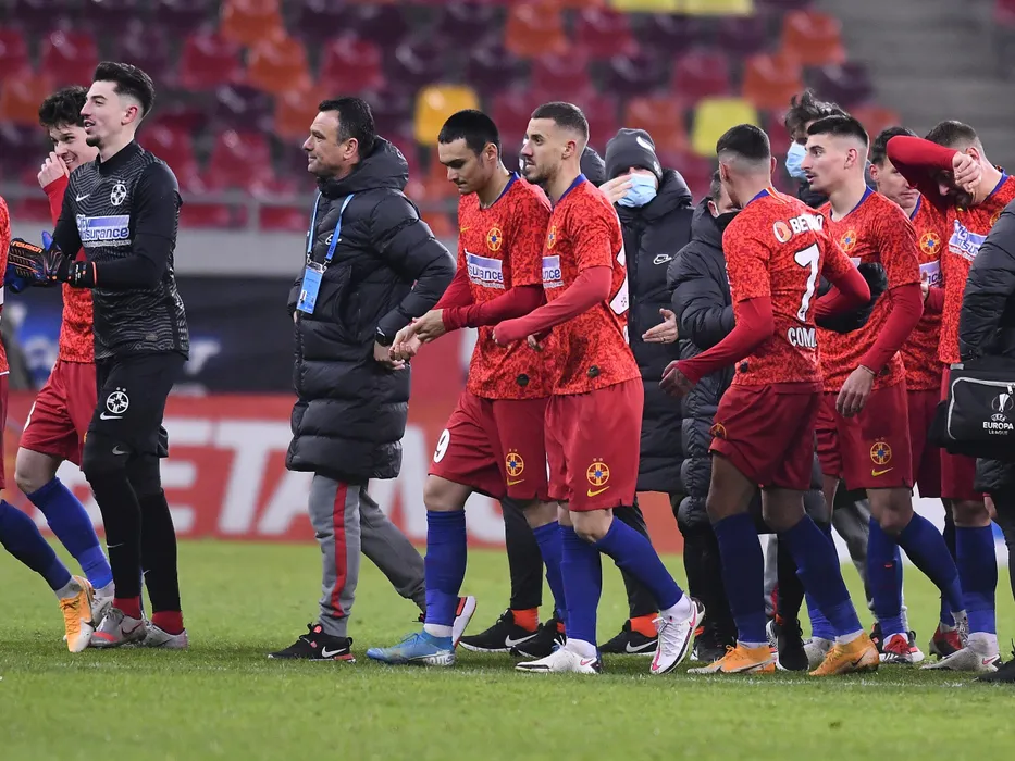 Fotbalistii stelisti alaturi de staff-ul condus de catre Toni Petrea se bucura dupa meciul de fotbal dintre FCSB si Astra Giurgiu, contand pentru Liga 1 Casa Pariurilor, desfasurat fara spectatori pe Arena Nationala din Bucuresti, vineri 15 ianuarie 2021. © FOTO:Razvan Pasarica/SPORT PICTURES