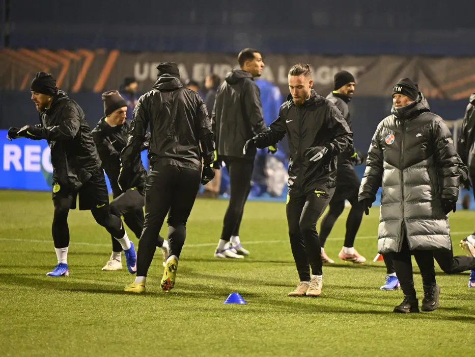 Fotbalistii de la FCSB Denis Alibec si Ofri Arad alături de Thomas Neubert la antrenamentul oficial de dinaintea meciului impotriva celor de la GNK Dinamo Zagreb, din cadrul UEFA Europa League, desfasurat pe Stadionul Maximir din Zagreb, miercuri 21 ianuarie 2026. © FOTO:Razvan Pasarica/SPORT PICTURES