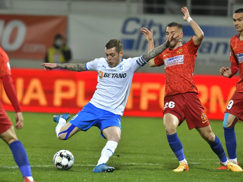 Alexandru Cicaldau si Razvan Constantin Oaida in meciul de fotbal dintre FCSB si Universitatea Craiova, contand pentru Liga 1 Casa Pariurilor, desfasurat fara spectatori pe Stadionul Marin Anastasovici din Giurgiu, duminica 4 aprilie 2021. © FOTO:Razvan Pasarica/SPORT PICTURES
