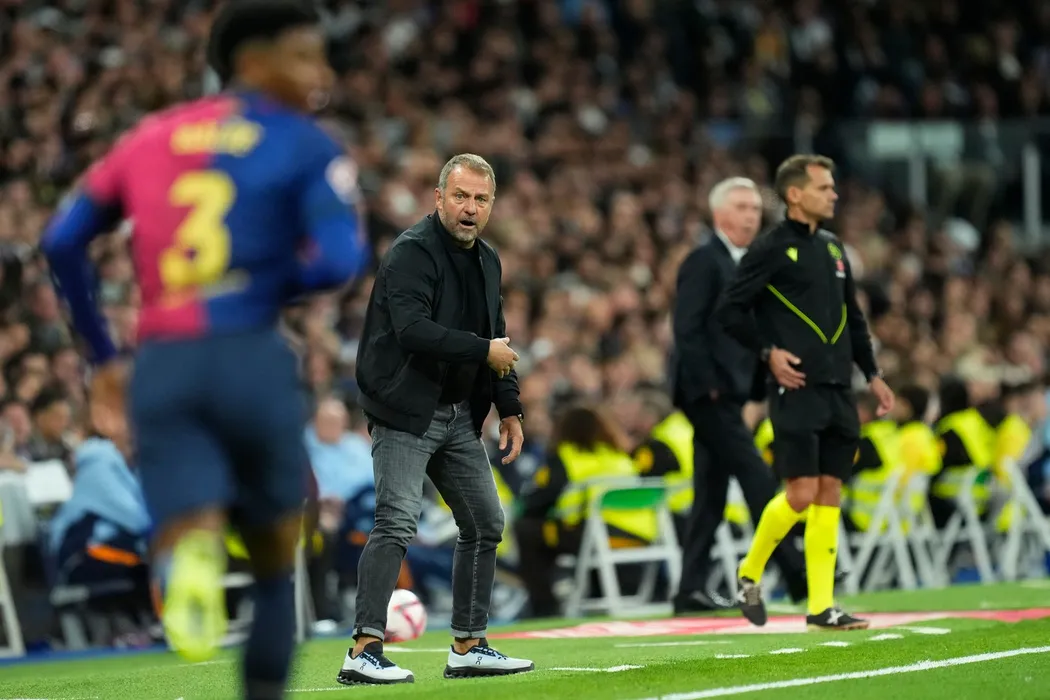 Hansi Flick head coach of Barcelona during the La Liga match between Real Madrid CF and FC Barcelona at Estadio Santiago Bernabeu on October 27, 2024 in Madrid, Spain.
