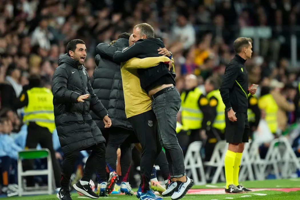 Hansi Flick head coach of Barcelona celebrates the goal of his team during the La Liga match between Real Madrid CF and FC Barcelona at Estadio Santiago Bernabeu on October 27, 2024 in Madrid, Spain.