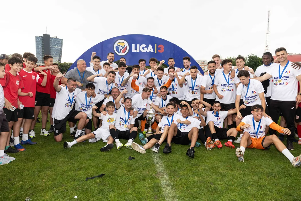Fotbalistii dinamovisti se bucura intr-o fotografie de grup pentru calificarea in Liga 2 realizata dupa meciul de fotbal dintre CS Dinamo Bucuresti si ACS Vedita Colonesti, contand pentru Baraj de promovare Liga 2, Finala, desfasurat pe Stadionul Dinamo Central din Bucuresti, miercuri 4 iunie 2025. © FOTO: Mihai Neacsu/SPORT PICTURES