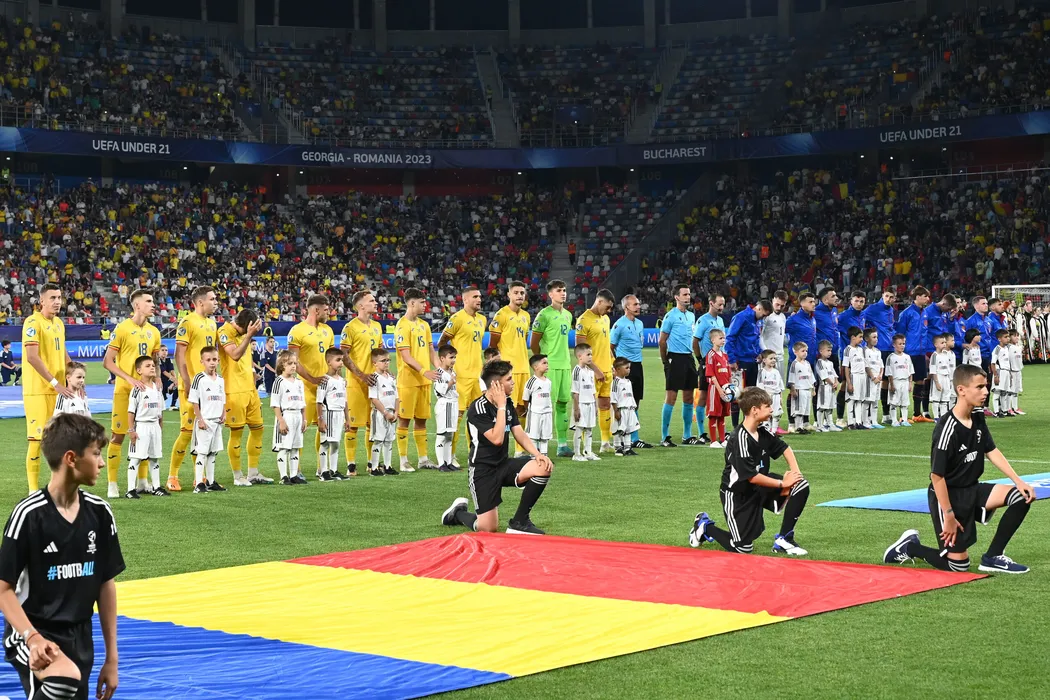 Fotbalistii celor doua echipe la startul meciului de fotbal dintre Romania U21 si Spania U21, contand pentru Campionatul European U21, desfasurat pe Stadionul Steaua din Bucuresti, miercuri 21 iunie 2023.© FOTO:Razvan Pasarica/SPORT PICTURES