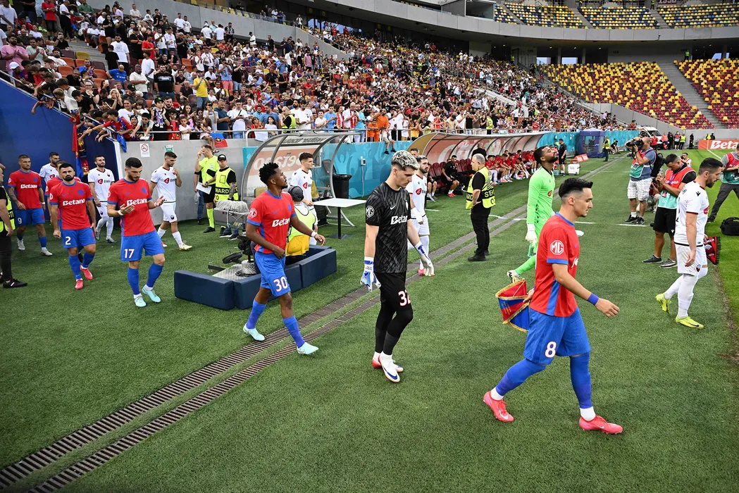 Fotbalistii celor doua echipe printre care George Daniel Bîrligea, Valentin Cretu, Mihai Popescu, Siyabonga Ngezana, Ștefan Târnovanu si Adrian Gheorghe Șut la startul meciului in meciul de fotbal dintre FCSB si KF Shkendija, contand pentru Preliminariile Ligii Campionilor, desfasurat pe Arena Nationala din Bucuresti, miercuri 30 iulie 2025. © FOTO:Razvan Pasarica/SPORT PICTURES