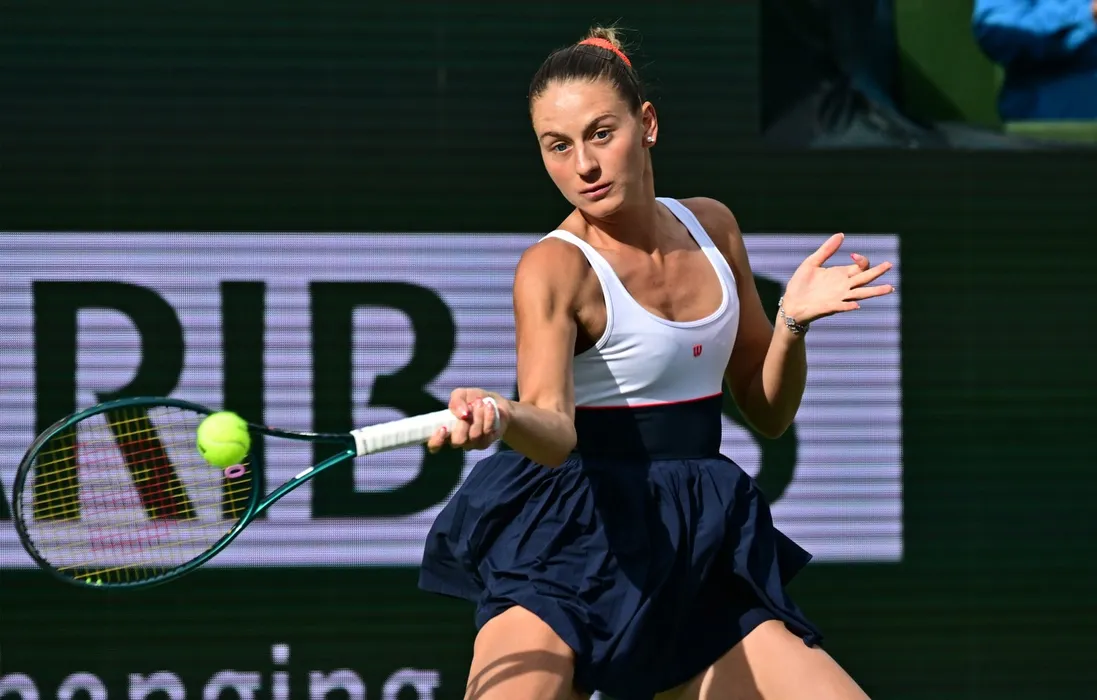 Ukraine's Marta Kostyuk hits a forehand return to Poland's Iga Swiatek during their ATP-WTA Indian Wells Masters women's semifinal tennis match at the Indian Wells Tennis Garden in Indian Wells, California, on March 15, 2024.,Image: 857237284, License: Rights-managed, Restrictions: , Model Release: no