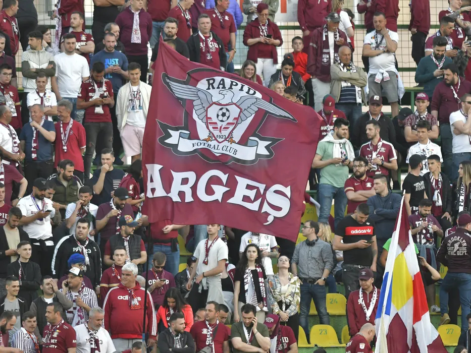 Suporterii rapidisti cu un steag visiniu cu inscriptia Arges isi incurajeaza favoritii la meciul de fotbal dintre CS Mioveni si Rapid Bucuresti, contand pentru Play-out-ul Ligii 1 Casa Pariurilor, desfasurat pe Stadionul Orasenesc din Mioveni, luni 16 mai 2022. © FOTO:Razvan Pasarica/SPORT PICTURES