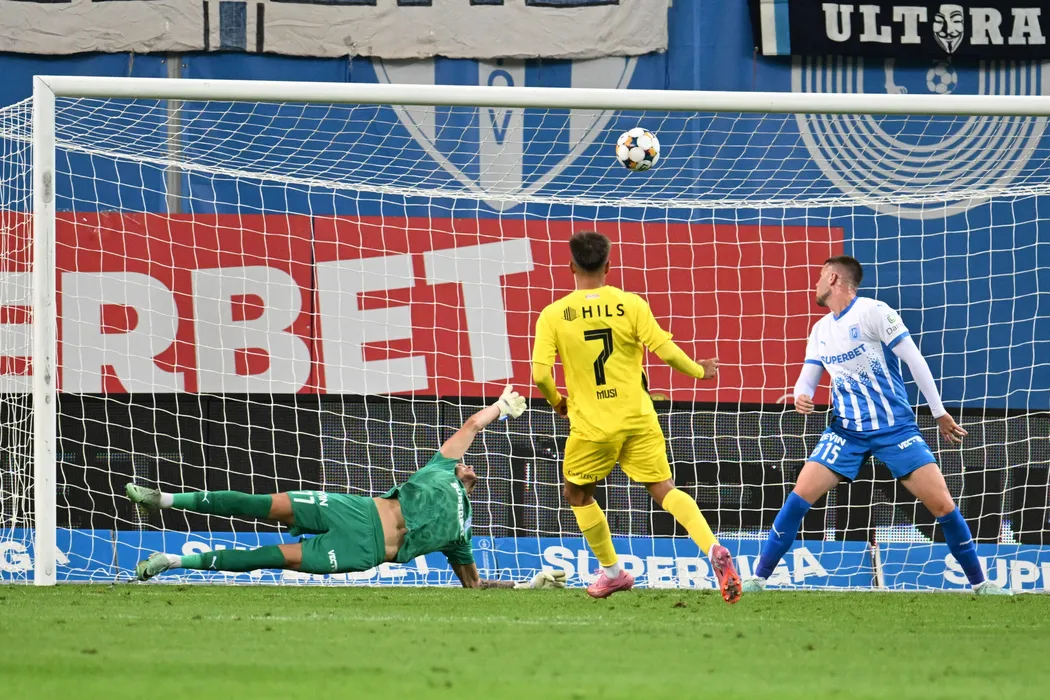 Alexandru Marian Musi marchează un gol în poarta lui Pavlo Isenko de langa Juraj Badelj in meciul dintre Universitatea Craiova si Dinamo Bucuresti, contand pentru Superliga Superbet, desfasurat pe Stadionul Ion Oblemenco din Craiova, vineri 26 septembrie 2025. © FOTO:Razvan Pasarica/SPORT PICTURES