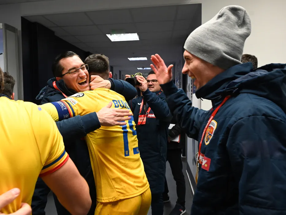 Razvan Burleanu ii felicita pe Andrei Burca si Florin Tanase dupa meciul de fotbal dintre Israel si Romania, din cadrul preliminariilor Campionatului European 2024, desfasurat pe Puskás Akadémia Pancho Aréna din Felcsut, sambata 18 noiembrie 2023. © FOTO:Razvan Pasarica/SPORT PICTURES