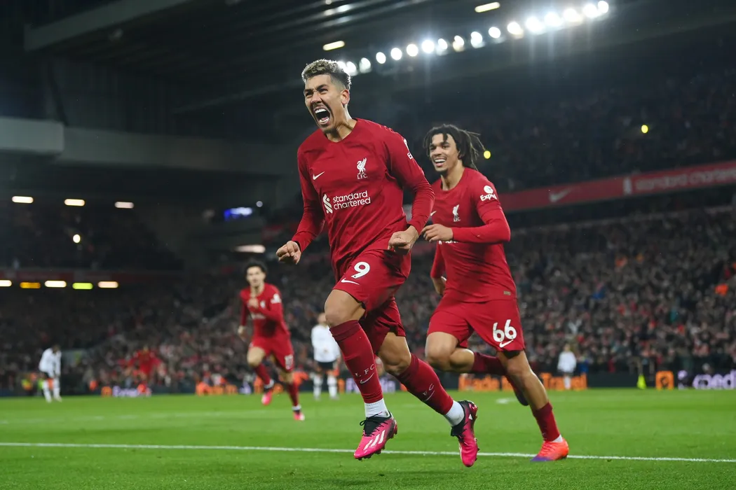 LIVERPOOL, ENGLAND - MARCH 05: Roberto Firmino of Liverpool celebrates after scoring the team's seventh goal with teammate Trent Alexander-Arnold during the Premier League match between Liverpool FC and Manchester United at Anfield on March 05, 2023 in Liverpool, England. (Photo by Michael Regan/Getty Images)