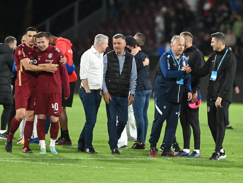 Ovidiu Stefan Hoban, Lovro Cvek, Dan Petrescu si Costin Curelea se bucura dupa meciul de fotbal dintre CFR Cluj si FC U Craiova, barajul din cadrul Superligii Superbet pentru UEFA Conference League, desfasurat pe Stadionul Dr. Constantin Radulescu din Cluj Napoca, joi 1 iunie 2023. © FOTO:Razvan Pasarica/SPORT PICTURES