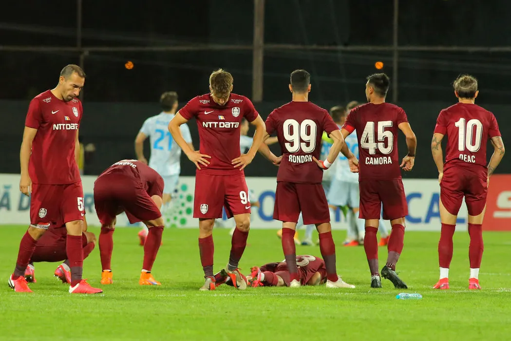 CLUJ-NAPOCA, ROMANIA - AUGUST 26: CFR Clujs players dissapointed after they are eliminated at the final of the UEFA Champions League Second Qualifying Round game between CFR Cluj and Dinamo Zagreb at Constantin Radulescu Stadium on August 26, 2020 in Cluj-Napoca, Romania. (Photo by Paul Ursachi/MB Media/Getty Images)