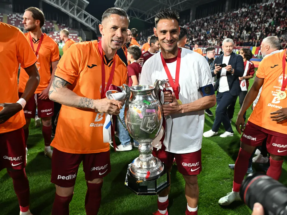 Ciprian Ioan Deac si Mario Camora (Malico Paulino Mario Jorge) pozeaza alături de trofeu dupa meciul de fotbal dintre CFR Cluj si FC Hermannstadt, finala Cupei Romaniei Betano, desfasurat pe Stadionul Francisc Neuman din Arad, miercuri 14 mai 2025. © FOTO:Razvan Pasarica/SPORT PICTURES