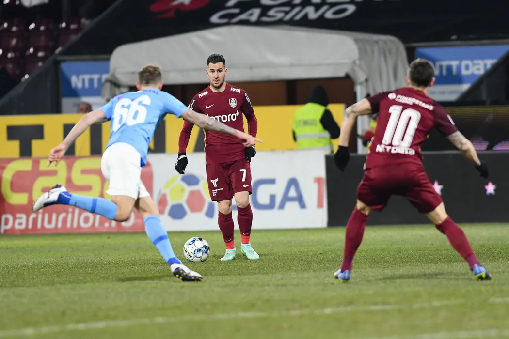 Adrian Paun (C), de la CFR Cluj, suteaza in timpul meciului de fotbal contra echipei FC Voluntari din prima etapa a play-off-ului Ligii 1, disputat pe stadionul Dr. Constantin Radulescu din Cluj-Napoca, sambata, 12 martie 2022. FLAVIU BUBOI / MEDIAFAX FOTO