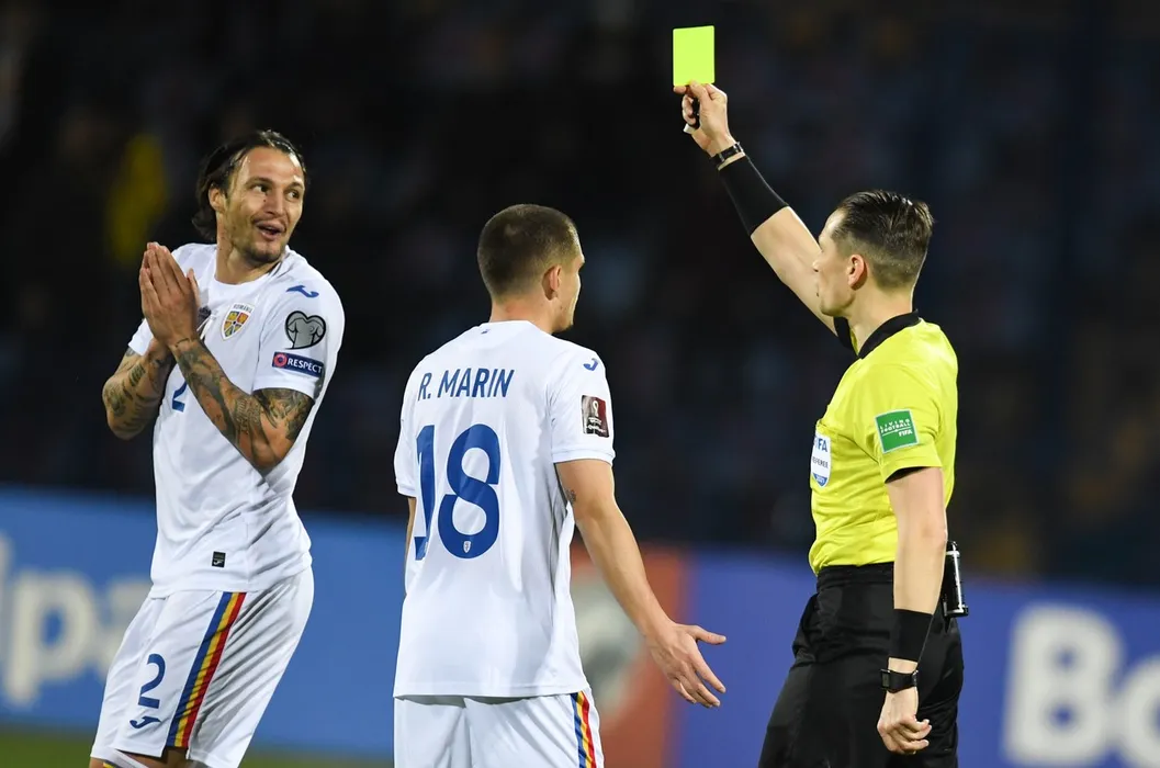 6503385 31.03.2021 Referee shows a yellow card to Romania's Vasile Mogos during the World Cup qualifying soccer match between Armenia and Romania, in Yerevan, Armenia.,Image: 602579191, License: Rights-managed, Restrictions: Editors' note: THIS IMAGE IS PROVIDED BY RUSSIAN STATE-OWNED AGENCY SPUTNIK., Model Release: no