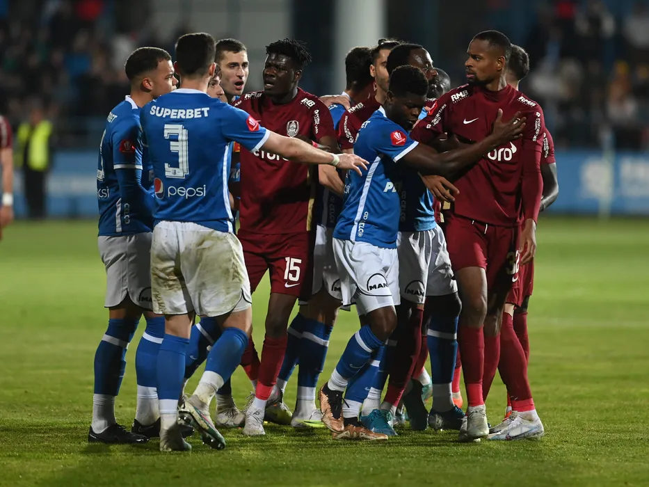 Fotbalistii Gustavo Henrique Marins Silva, Ionut Justinian Larie, Emmanuel Yeboah,Enagnon David Kiki si Rangelo Maria Janga in meciul de fotbal dintre Farul Constanta si CFR Cluj, contand pentru Play-off-ul Superligii Superbet, desfasurat pe Stadionul central al Academiei Gheorghe Hagi din Ovidiu, sambata 22 aprilie 2023. © FOTO:Razvan Pasarica/SPORT PICTURES