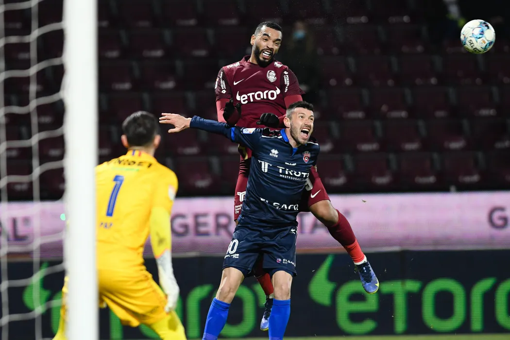 Billel Omrani (sus), de la CFR Cluj, lupta pentru balon cu Alexandru Tiganasu (jos), de la FC Botosani, in meciul de fotbal din etapa a XXIII - a a Ligii 1, disputat pe stadionul Dr. Constantin Radulescu din Cluj-Napoca, luni, 31 ianuarie 2022. FLAVIU BUBOI / MEDIAFAX FOTO