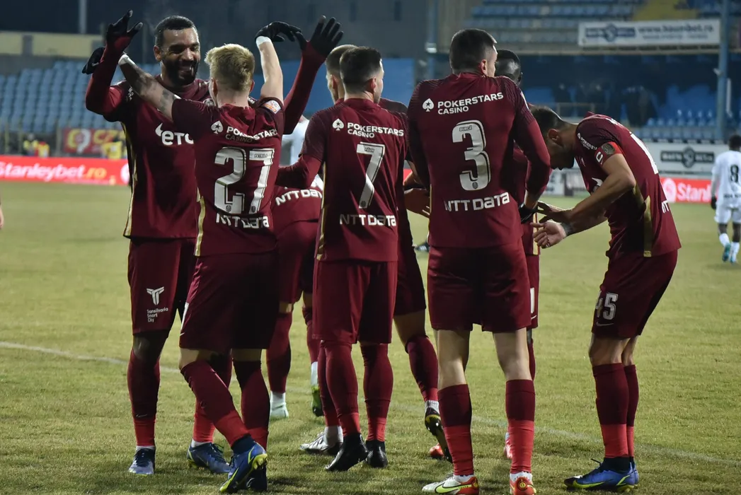 Claudiu Adrian Mihai Petrila se bucura dupa un gol marcat alaturi de colegii sai in meciul de fotbal dintre Gaz Metan Medias si CFR Cluj, contand pentru Liga 1 Casa Pariurilor, desfasurat pe Stadionul Municipal din Medias, sambata 12 februarie 2022. © FOTO:Alexandru Veres/SPORT PICTURES