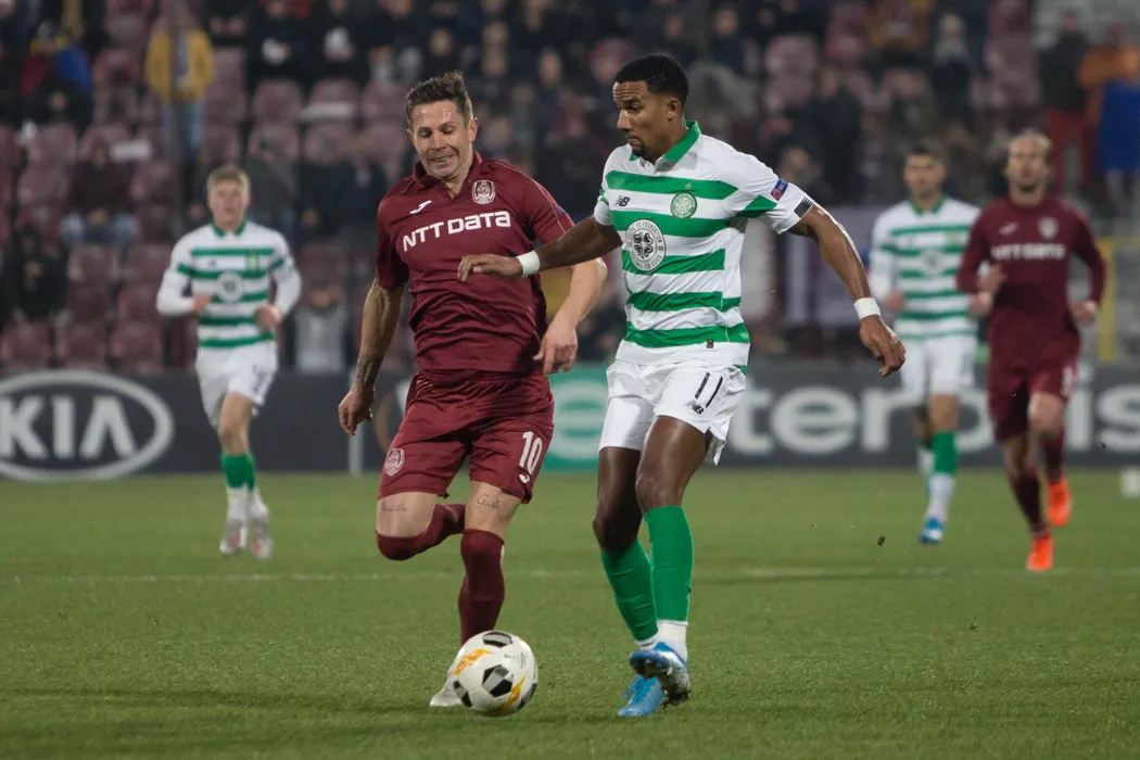 Ciprian Deac (S), de la CFR Cluj, lupta pentru balon cu Boli Bolingoli-Mbombo (D), de la Celtic, in timpul meciului de fotbal din Grupa E a Ligii Europa, disputat pe stadionul Dr. Constantin Radulescu din Cluj-Napoca, joi, 12 decembrie 2019. ALEXANDRA PANDREA / MEDIAFAX FOTO