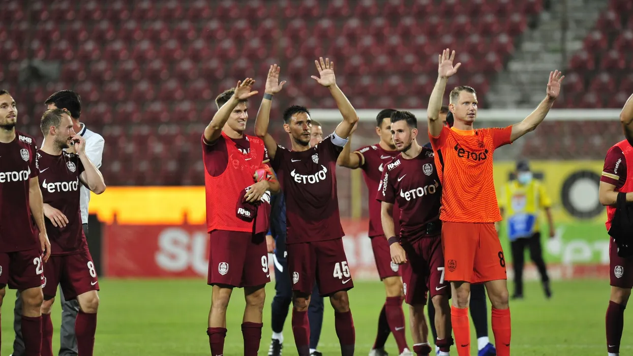 Jucatorii formatiei CFR Cluj salute suporterii la finalul meciului de fotbal contra echipei Borac Banja Luka din primul tur preliminar al Ligii Campionilor, disputat pe stadionul Dr. Constantin Radulescu din Cluj-Napoca, marti, 6 iulie 2021. DAN HORIA TAUTAN / MEDIAFAX FOTO