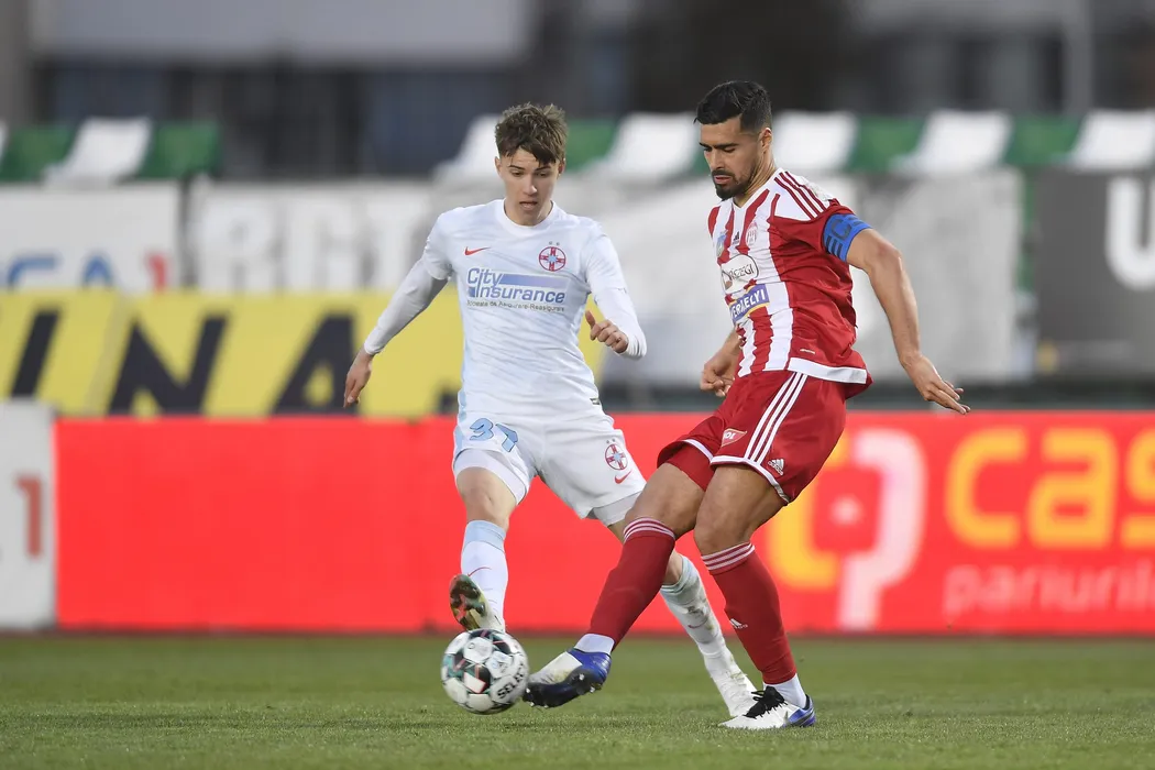 Rashid Bouhenna (D), de la Sepsi OSK, lupta pentru balon cu Octavian Popescu (S), de la FCSB, in meciul de fotbal din etapa 30 a Ligii 1, disputat pe stadionul Municipal din Sfantu Gheorghe, sambata,10 aprilie 2021. ALEX NICODIM / MEDIAFAX FOTO