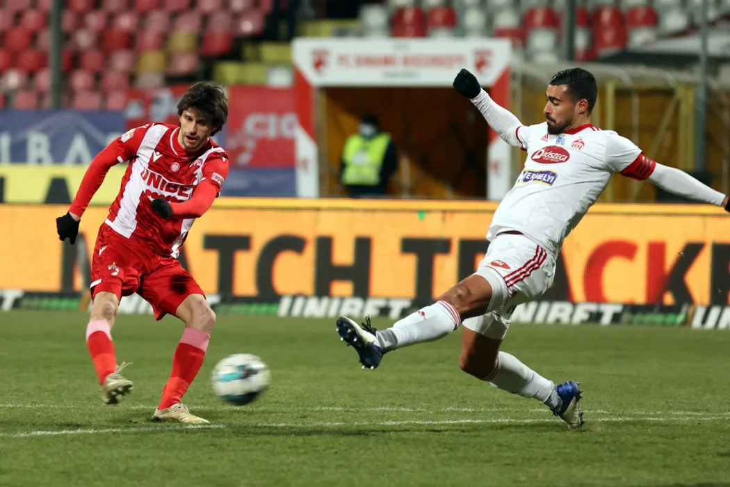 Diego Fabbrini (S), de la Dinamo, lupta pentru balon cu Rachid Bouhenna (D), de la Sepsi OSK, in meciul de fotbal din etapa a XXIII-a a Ligii 1, disputat pe stadionul Dinamo din Bucuresti, sambata, 13 februarie 2021. GEORGE FILIP / MEDIAFAX FOTO