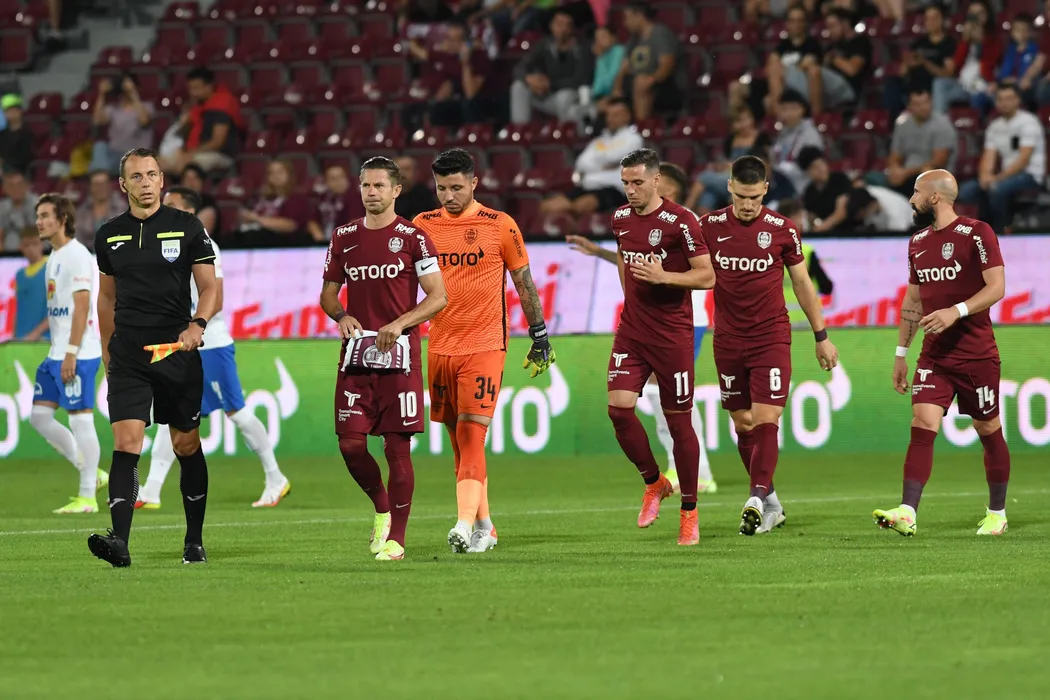 Jucatorii formatiei CFR Cluj reactioneaza in timpul meciului de fotbal contra echipei FC Farul din etapa a IV-a a Ligii 1, disputat pe stadionul Dr. Constantin Radulescu, vineri, 13 august 2021. FLAVIU BUBOI / MEDIAFAX FOTO