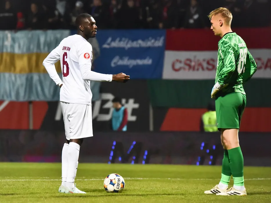 Sheriff Sinyan si Otto Hindrich in meciul de fotbal dintre FK Csikszereda Miercurea Ciuc si FC CFR 1907 Cluj, contand pentru Superliga Superbet, desfasurat pe Stadionul Municipal din Miercurea Ciuc, joi 16 octombrie 2025. © FOTO:Zoltan Pal/SPORT PICTURES