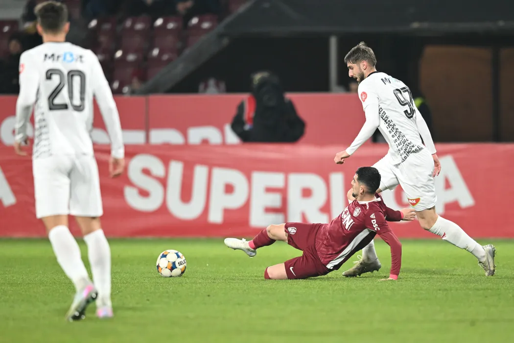 Meriton Korenica si Bence Végh în meciul de fotbal dintre CFR Cluj si FK Csikszereda Miercurea Ciuc, contând pentru Superliga Superbet, desfășurat pe Stadionul Dr. Constantin Raduescu din Cluj Napoca, vineri 12 decembrie 2025. © FOTO: Flaviu Buboi/SPORT PICTURES