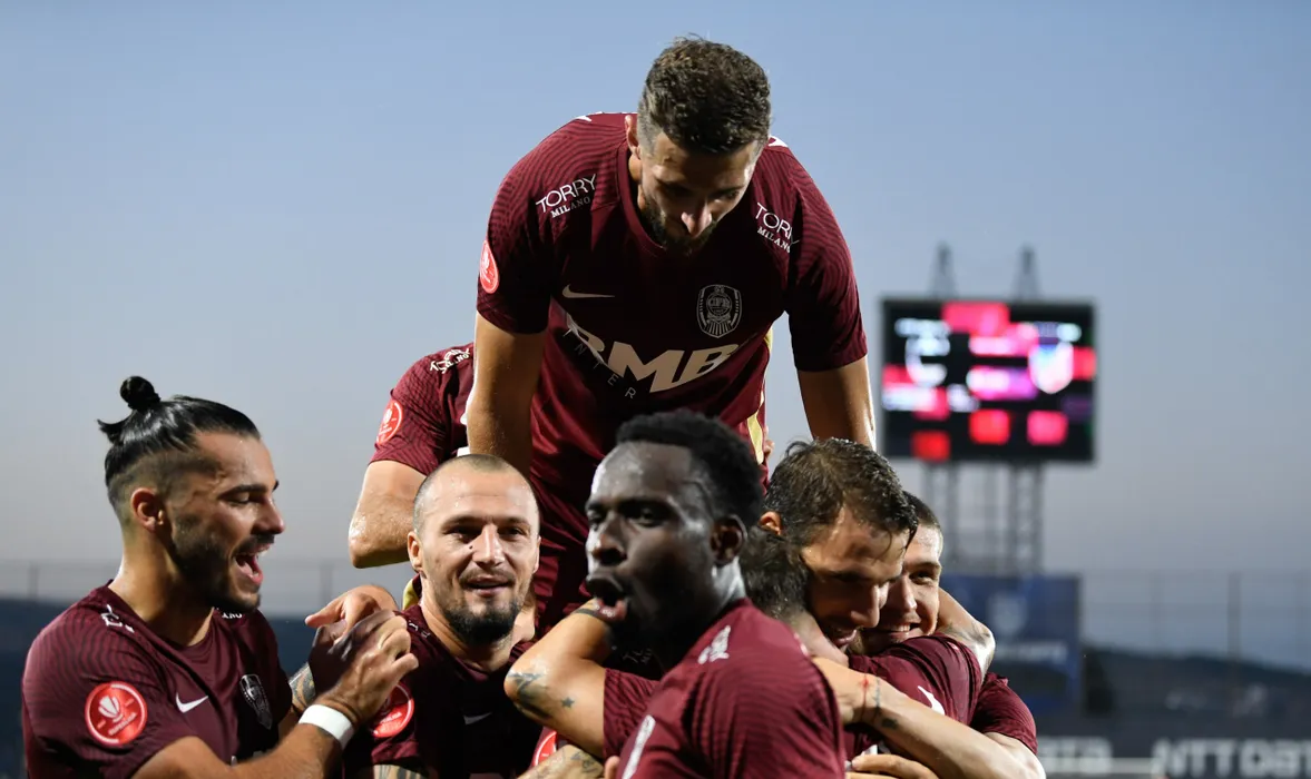 Jucatorii formatiei CFR Cluj reactioneaza dupa ce au inscris al treilea gol in timpul meciului de fotbal contra echipei FC Botosani din etapa a VII-a a Superligii, disputat pe stadionul Dr. Constantin Radulescu din Cluj-Napoca, sambata, 26 august 2023. FLAVIU BUBOI / MEDIAFAX FOTO
