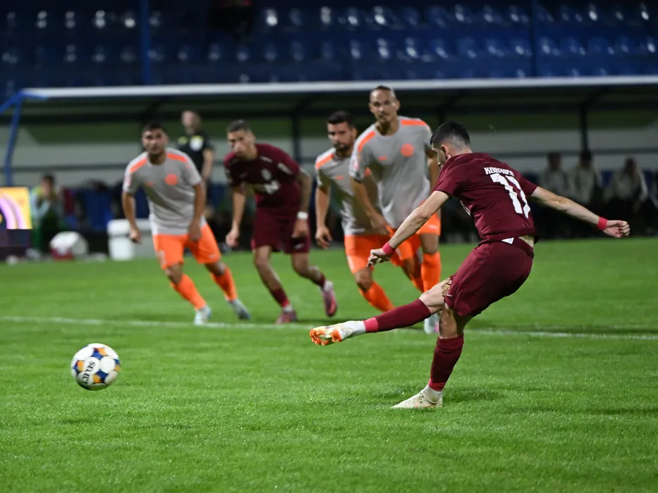 Meriton Korenica marcheaza un gol din penalty in meciul de fotbal dintre Metaloglobus Bucuresti si CFR Cluj, contand pentru Superliga Superbet, desfasurat pe Clinceni Arena din Clinceni, sambata 13 septembrie 2025. © FOTO:Razvan Pasarica/SPORT PICTURES