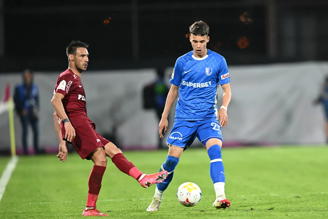 Mario Camora (Malico Paulino Mario Jorge) si Ianis Andrei Avramescu in meciul de fotbal dintre FC CFR 1907 Cluj si FC Farul Constanta, contand pentru Semifinala Cupei Romaniei Betano, desfasurat pe Stadionul Dr.Constantin Radulescu din Cluj-Napoca, joi 24 aprilie 2025. © FOTO: Flaviu Buboi/SPORT PICTURES