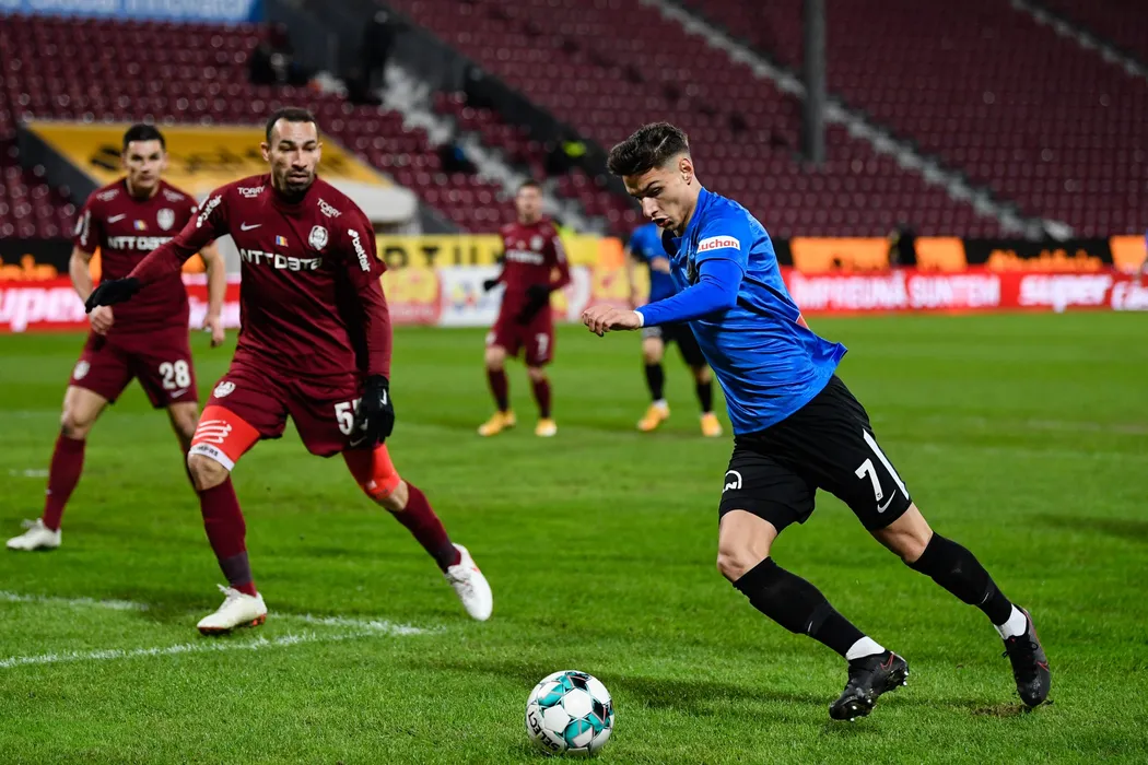 George Danut Ganea de la Viitorul Constanta (echipament albastru-negru), incearca sa-si depaseasca adversarii in timpul partidei dintre CFR Cluj si Viitorul Constanta, partida desfasurata in etapa 21 sezonul 2020 - 2021 din Liga 1 de fotbal, joi 04 februarie 2021, in Cluj-Napoca. FLAVIU BUBOI / MEDIAFAX FOTO