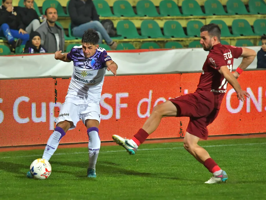 Florin Borța și Constantin Adrian Păun în meciul de fotbal dintre ACS Campionii Fotbal Club Argeș și FC CFR 1907 Cluj, contând pentru Cupa României Betano, desfășurat pe Stadionul Orășenesc din Mioveni, marți 29 octombrie 2024. © FOTO: Mihai NIȚOIU/SPORT PICTURES