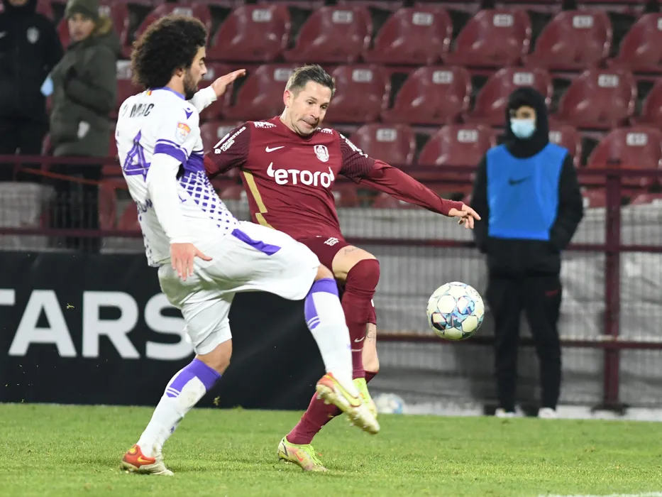 Ciprian Ioan Deac si Joao Miguel Xavier Ferreira Dos Santos in meciul de fotbal dintre CFR Cluj si FC Arges, contand pentru Liga 1 Casa Pariurilor, desfasurat pe Stadionul Dr. Constantin Radulescu din Cluj Napoca, duminica 19 decembrie 2021. © FOTO:Flaviu Buboi/SPORT PICTURES
