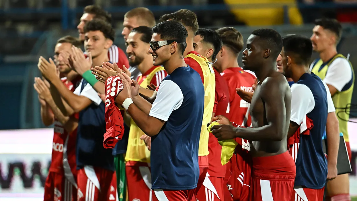 Fotbalistii botoseneni printre care Adi Marian Chică Roșă, Charles Petro si Narcis Cosmin Ilas saluta galeria dupa meciul de fotbal dintre Farul Constanta si FC Botosani, contand pentru Superliga Superbet, desfasurat pe Stadionul central al Academiei Gheorghe Hagi din Ovidiu, duminica 28 iulie 2024. © FOTO:Razvan Pasarica/SPORT PICTURES
