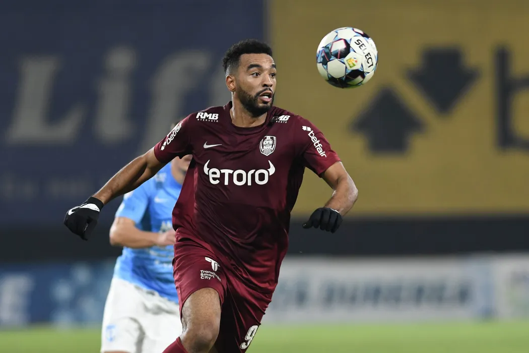 Billel Omrani, de la CFR Cluj, suteaza in timpul meciului de fotbal contra echipei FC Voluntari din etapa a XIV - a a Ligii 1, disputat pe stadionul Dr. Constantin Radulescu, sambata, 30 octombrie 2021. FLAVIU BUBOI / MEDIAFAX FOTO