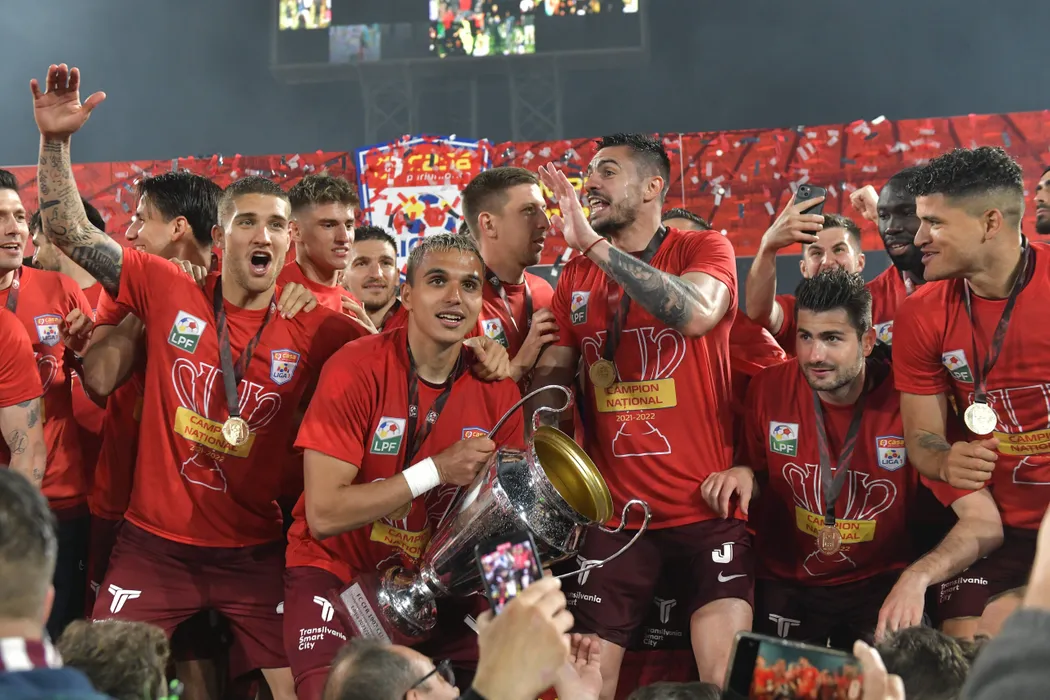 Bucurie clujeana cu George Daniel Birligea, Cristian Marian Manea, Andonie Andrei Burca, Florin Bogdan Stefan si Jefferson Yuri De Sousa Matias dupa castigarea campionatului in urma meciului de fotbal dintre CFR Cluj si Universitatea Craiova, contand pentru Play-off-ul Ligii 1 Casa Pariurilor, desfasurat pe Stadionul CFR Dr. Constantin Radulescu din Cluj Napoca, duminica 15 mai 2022. © FOTO:Razvan Pasarica/SPORT PICTURES