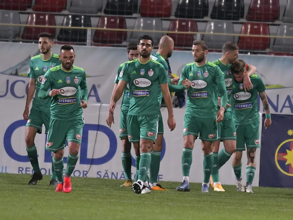 Bucurie a fotbalistilor de la Sepsi dupa un gol marcat cu Bogdan Alexandru Mitrea, Radoslav Dimitrov, Rachid Ahmed Bouhenna, Pavol Safranko, Bogdan Alexandru Mitrea si Mihai Claudiu Adrian Petrila in meciul de fotbal dintre FCSB si Sepsi OSK Sfantu Gheorghe, contand pentru Play-off-ul Ligii 1 Casa Pariurilor, desfasurat fara spectatori pe Stadionul Marin Anastasovici din Giurgiu, duminica 25 aprilie 2021. © FOTO:Razvan Pasarica/SPORT PICTURES